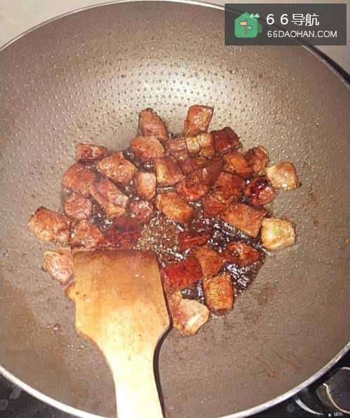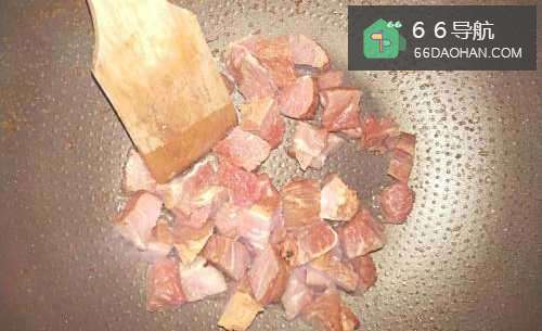 2如图,锅内放入适量色拉油,烧至八成热时放入切好的牛肉,翻炒两下。