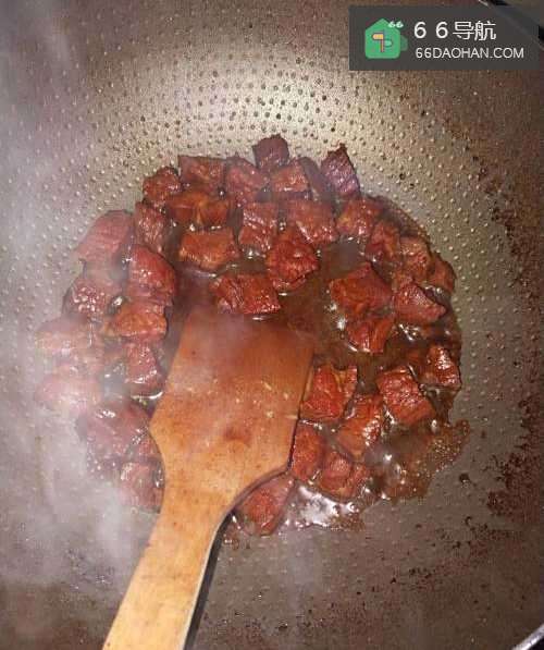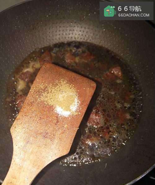 5如图,时间到后,可以发现锅里的牛肉已经熟透而且红亮,这时可以加入适量鸡精后关火。