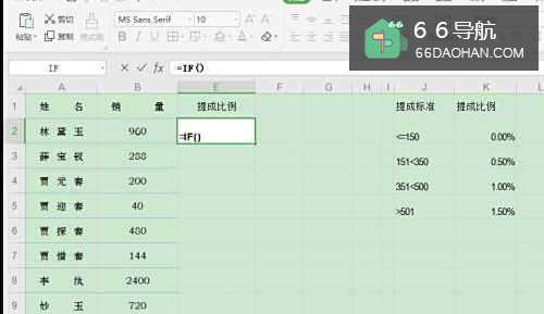 2选择单元格【E2】,在编辑栏输入函数【=IF()】;