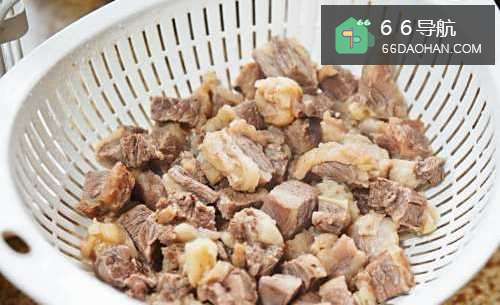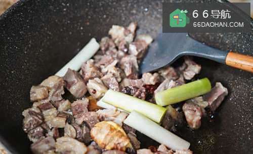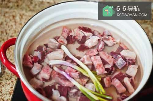 牛腩冷水下锅,放小葱葱白和适量料酒,除去血水。