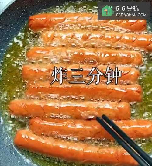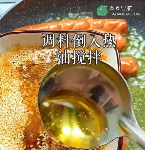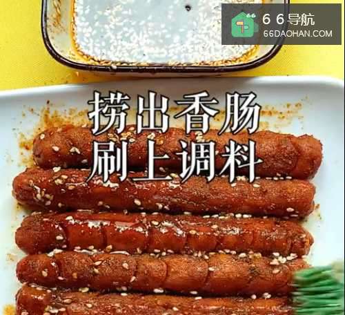 6●第六步捞出香肠,并且刷上调料碗中的调料,这样一道可口香肠小吃就做好了。