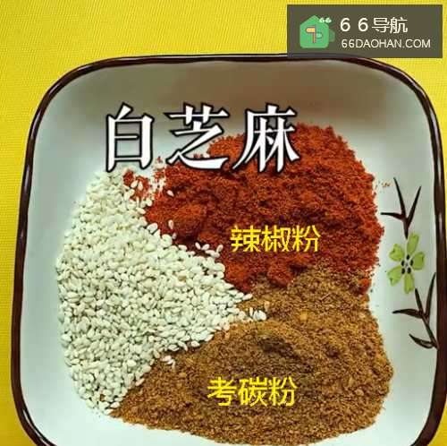 ●第一步准备一个调料碗,放入适量的白芝麻、辣椒粉以及考碳粉。