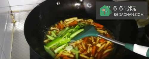 5最后,倒入准备好的青椒条,翻炒大概1分钟左右,就可以出锅享用了。