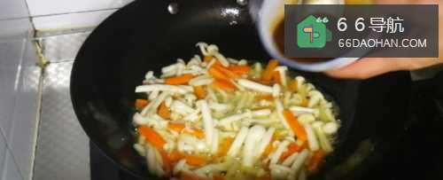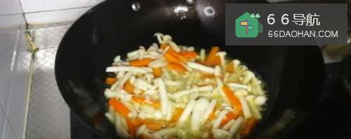 3接下来,我们再锅中烧热油,倒入准备好胡萝卜和白玉菇,将白玉菇翻炒至变软;
