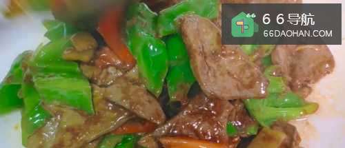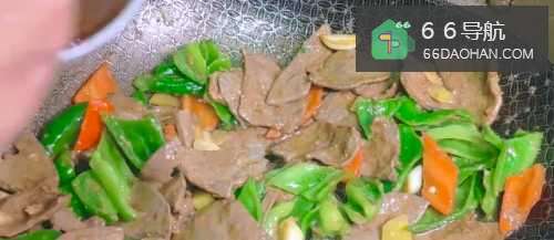 5⑤油锅下葱姜蒜末煸出香味,下木耳、青椒翻炒,倒入猪肝翻炒;