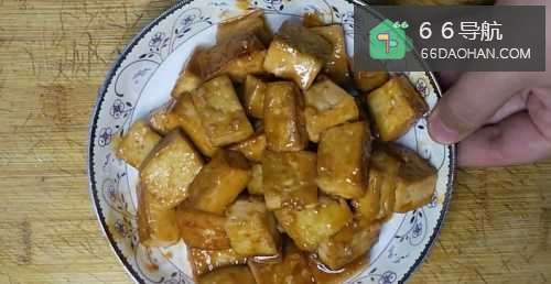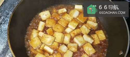 3、起锅烧油放入豆腐煎至金黄,放料汁焖煮。