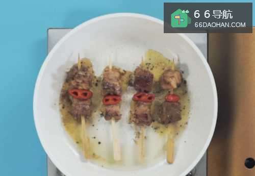 4接下来,起锅倒入油5ml,放入肉串大火煎至两面金黄;