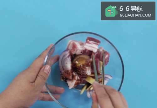 2接下来,往碗中倒入五花肉、姜片、洋葱片,随后倒入生抽,蚝油、适量辣椒面,盐搅拌均匀,腌制1小时左右;