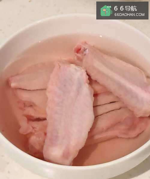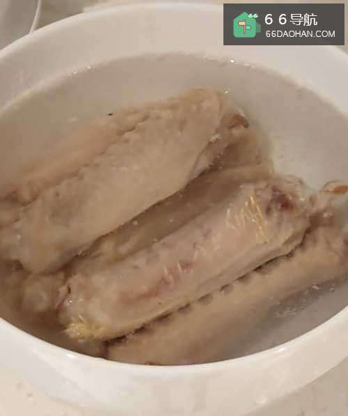 2锅中加水放入鸭翅,同时放入几片姜和葱,不要全放了,剩下的还要用,倒入少许料酒,焯水