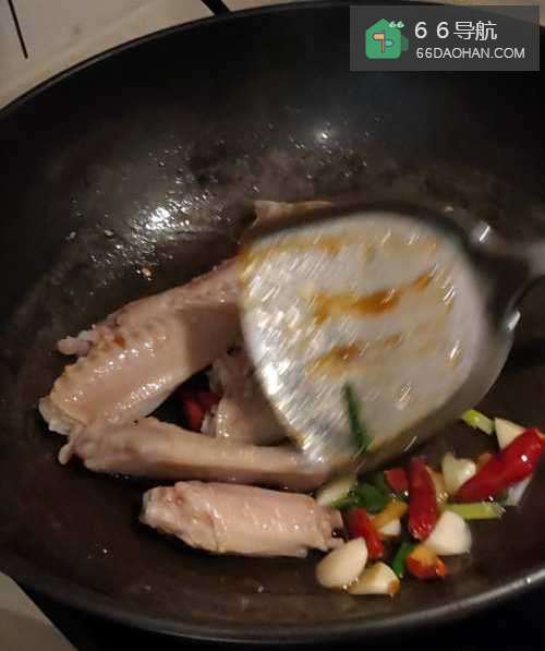 5倒入鸡翅,翻炒至微焦黄,然后倒入1勺料酒2勺生抽1勺老抽,翻炒上色均匀