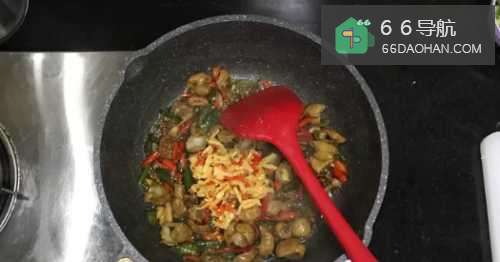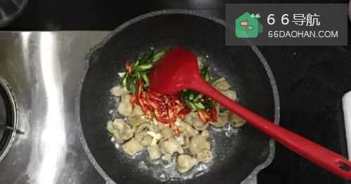 66.加入准备好的酸萝卜,继续翻炒几分钟,直到七八熟为止。