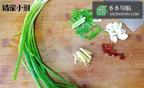 4图右炝锅的香葱切小段,蒜切片,姜切丝,干辣椒切段,再准备图左的一小把香葱切大段准备做葱油。