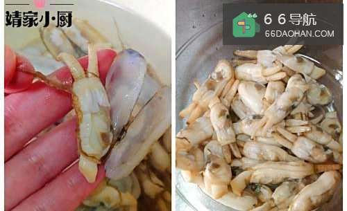 3待蛏子不烫手了,把蛏子的壳去掉,顺手把蛏子上围的一圈黑线也去掉吧。
