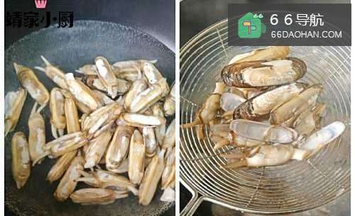 2锅中加水烧开,放一点盐,倒入洗好的蛏子,煮至开口即可捞出,放入凉水中冷却。