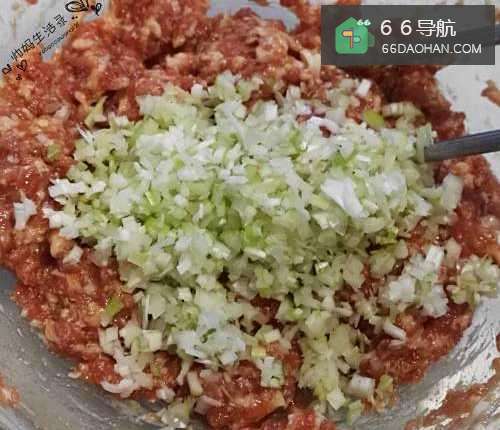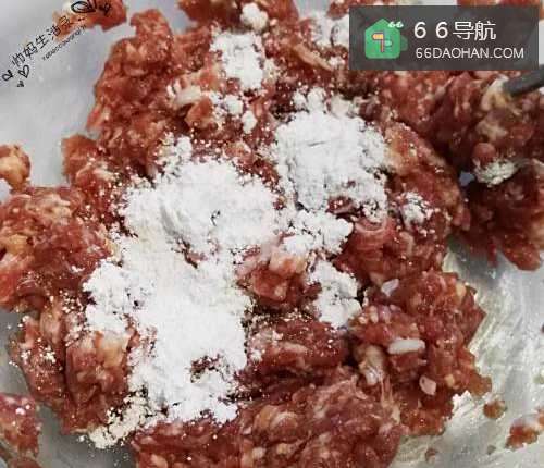 4在搅拌好的肉馅中加入生粉,搅拌均匀后,加入姜末,继续搅拌,姜末拌均匀后,在肉馅中分次加入少量清水,边加边顺一个方向搅拌,肉馅再加入下一次,肉馅充分吃水后会使口感嫩滑。