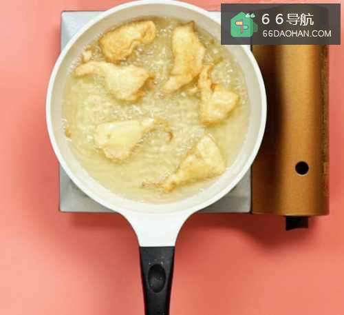 5接下来,我们将平菇裹满面糊,用小火炸;