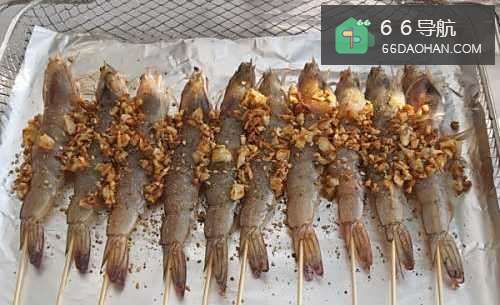 2、用锡纸盖住烤篮,把处理好的大虾摆好。