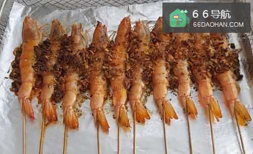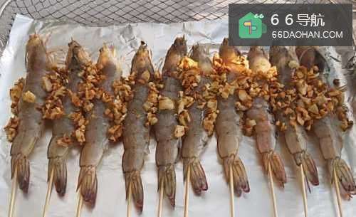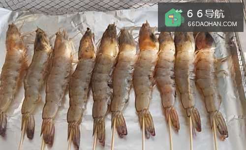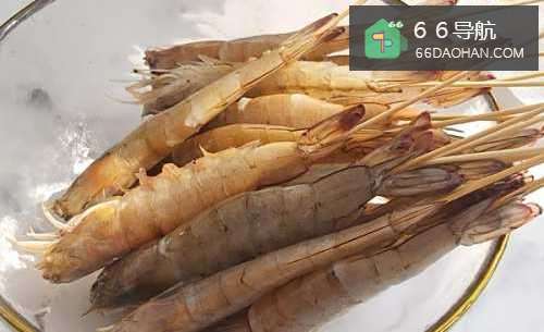 1、冲洗虾,去除虾丝,打开后盖,取出虾串,然后用竹签串在一起。