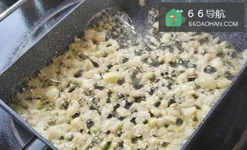 4接下来,将炸好的蒜末撒在虾的表面。