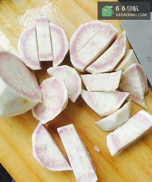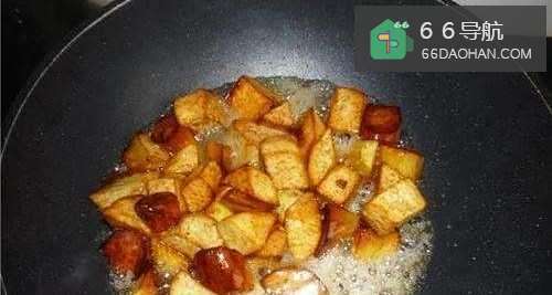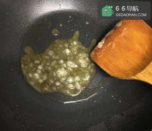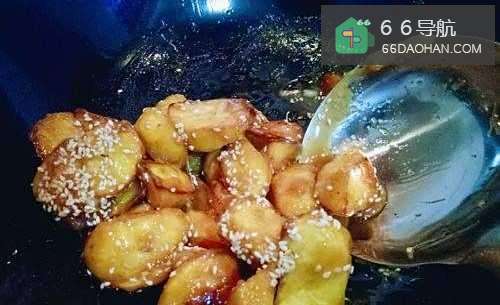 5炒至糖液变成琥珀色时倒入地瓜快速翻炒