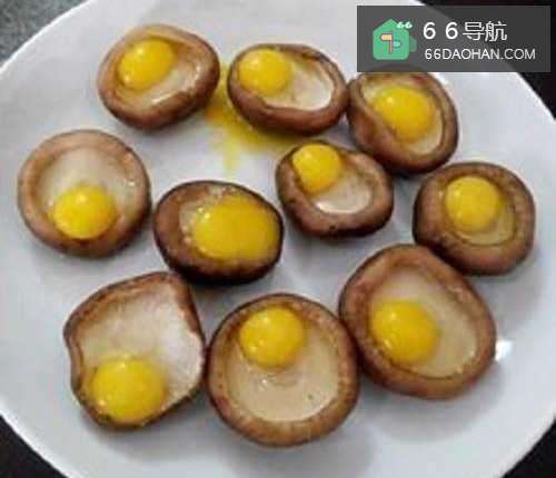 4把香菇放入盘中,把肉先放入香菇中,然后鹌鹑蛋打入香菇中。