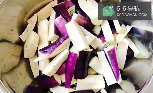 首先将茄子切成条,用盐腌渍20分钟,此步骤是为了茄子在制作过程中不变黑。