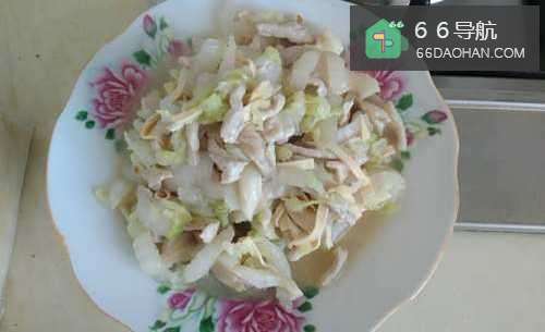 2白菜和平菇浸泡洗干净后切丝,百叶切丝,如图