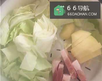 2接着把包菜、土豆、猪肉切成适度大小。