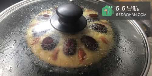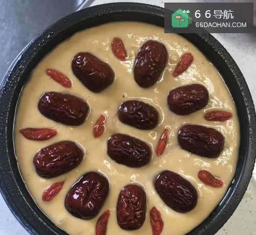 4将红枣、枸杞装点在发酵好的面糊上,此时面糊已具有弹性和承托力,红枣、枸杞会悬浮在面糊表面,而不会下沉。