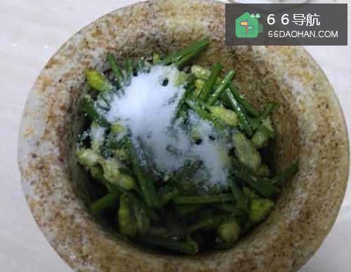 3然后我们把准备好的韭菜花放到石臼中(石臼就是北方用来捣蒜用的,由于我们的,韭菜花少一些,所以在家用石臼就可以了,如果制作的韭菜花多的话,需要到同石碾上压制),同时依个人的口味加入适量的食盐