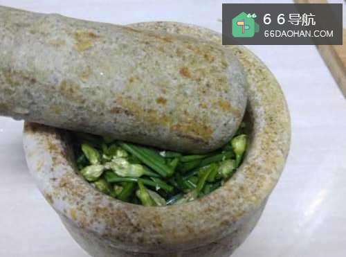 4接下来我们就在石臼中把准备好的韭菜花捣碎就可以了。