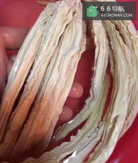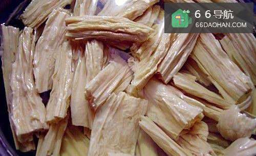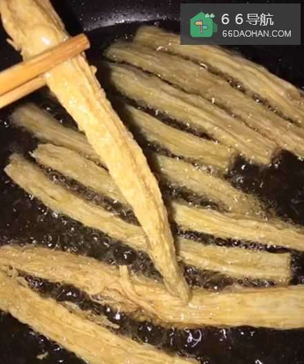 3锅里烧油,油温大概67成热时候放入腐竹,炸至金黄色后捞出备用,大概5分钟可以炸至成金黄色