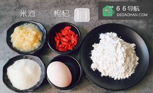 首先把需要的食材糯米粉、米酒、鸡蛋以及白糖和枸杞鸡蛋全部准备好备用。