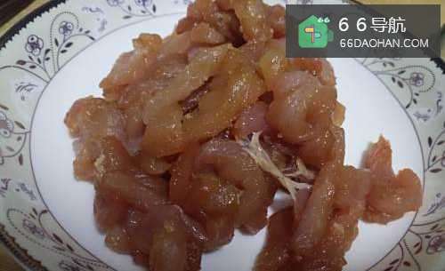 2猪肉切成细条,然后加入料酒少许、食盐、酱油、五香粉腌一下。