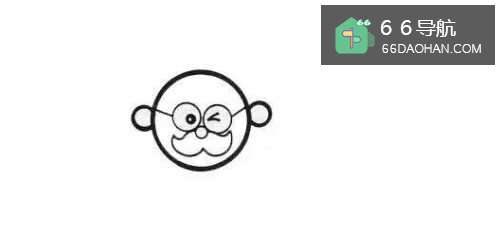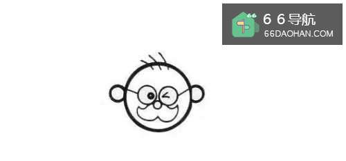 5第5步,这一步我们把老人的两只耳朵画出来,上面我们把眼镜儿的两个横梁都画出来了,我们知道眼镜的横梁是挂在耳朵上的,所以在这两个线的末端画两个小圆,表示老人的耳朵,