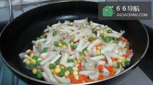 9然后放入玉米,胡萝卜,青豆一起炒下