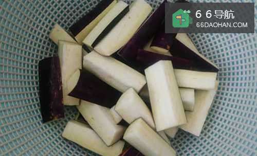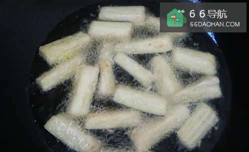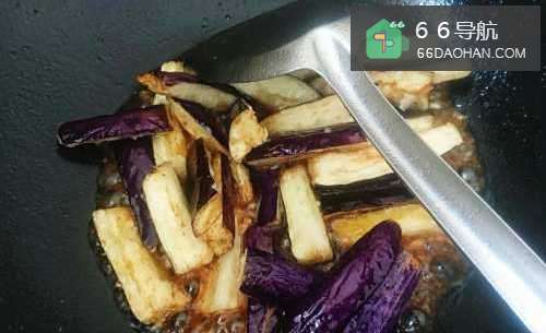 5锅中倒油烧热,将茄子放进去炸至外表焦黄后捞出备用。