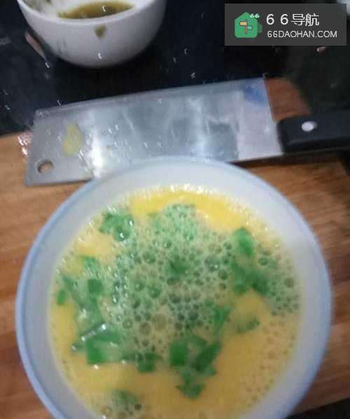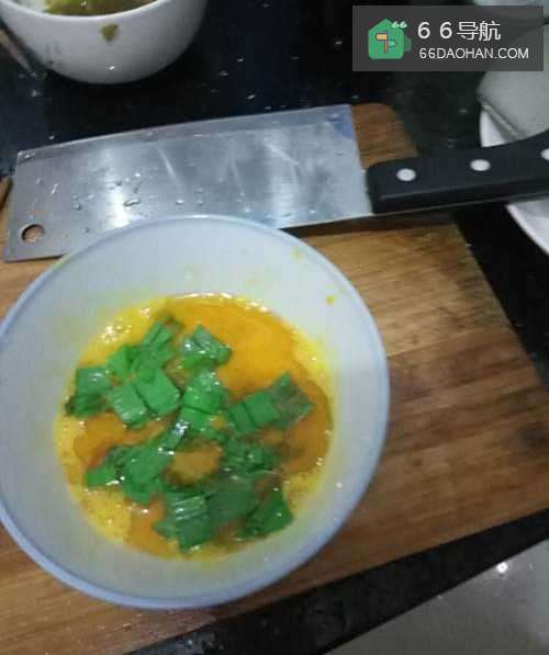 4把蒜叶切碎,撒入调好的鸡蛋中。