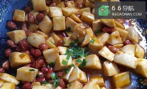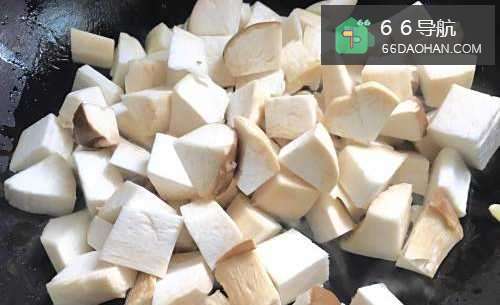 首先将花生米炸熟,杏鲍菇洗净切成丁备用。