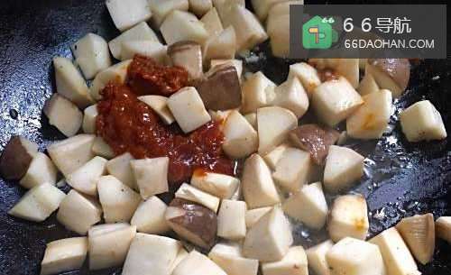 3待杏鲍菇稍稍出水之后加入一大勺豆瓣酱。