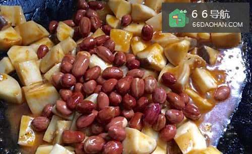 5大火烧开之后把炸好的花生米倒进去继续翻炒。