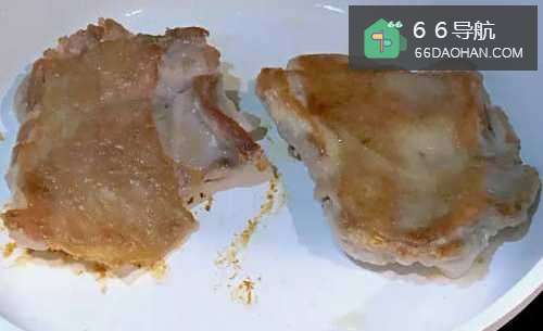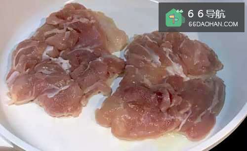 3锅中不加油,加热后以鸡皮朝下的方式放入鸡腿肉粒匠,中火煎1分钟,后转小火煎56分钟,煎至表皮金黄酥脆