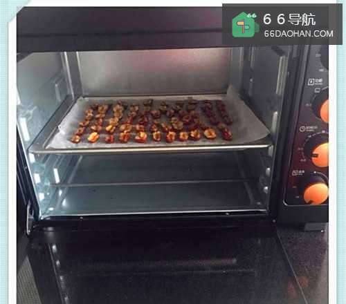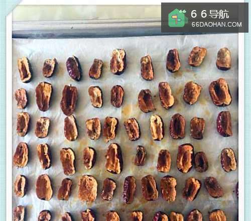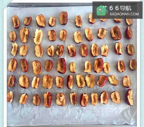3把切好的红枣摆放在烤盘上,放入烤箱