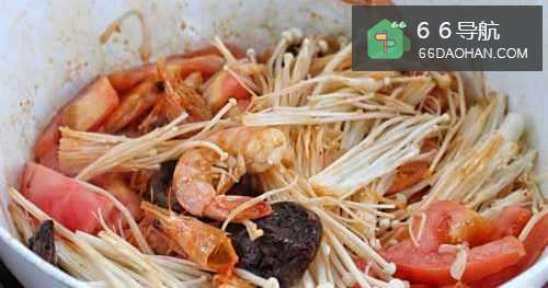 6然后放入金针菇、西红柿和香菇,翻炒均匀。