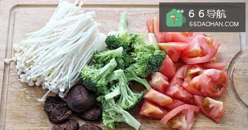 3干香菇提前泡发,金针菇洗净,西兰花掰成小把,西红柿切块状。