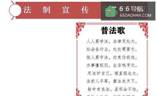 3在【法制宣传手抄报图片】的标题正下方的右侧位置处,写上普法歌的字及词,如下图所示。