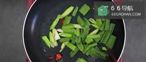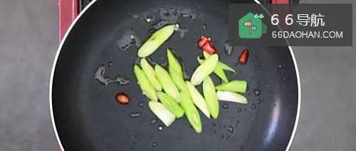 3锅内加油,油热,放入辣椒和蒜苗根爆香