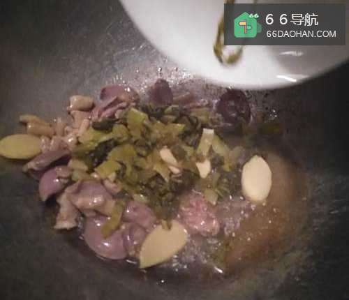 6鸡杂炒出香味后倒入酸菜进行翻炒,出锅时根据个人口味加入辣椒。