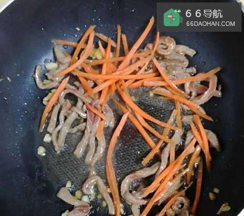 2里脊肉和胡萝卜切成丝,姜蒜切碎备用。