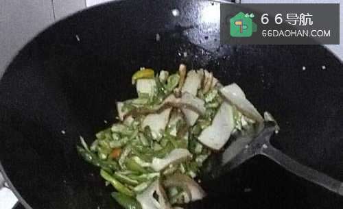 7待豆干炒至5成熟的时候,放进去切好的青椒丝,加入调味料继续翻炒。